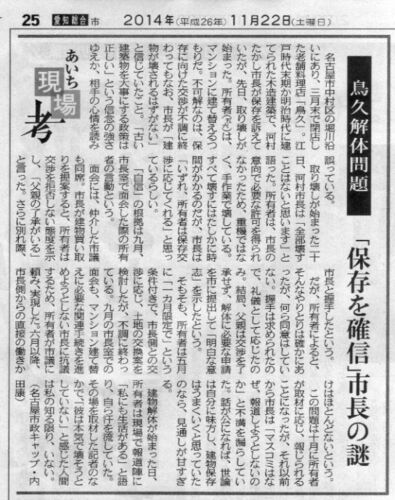 今朝から当ブログへのアクセスが上がっています。 解体されようとしている納屋橋の「鳥久」に対して、本来許されるべき道路占有許可を出さないという不当な「嫌がらせ」を名古屋市の河村市長が行い、所有者の事業を妨害している問題で、当ブログは手作業によ…
